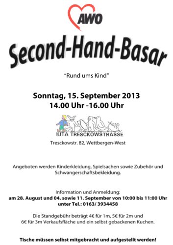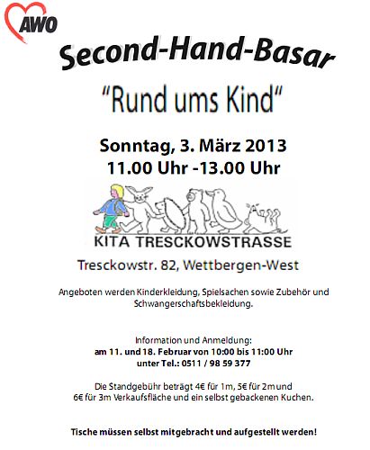 Ein Basar "Rund ums Kind" findet am Sonntag, den 15. September 2013 von 14:00 Uhr bis 16:00 Uhr in der AWO-Kindertagesstätte Tresckowstraße 82 in Hannover Wettbergen statt. Angeboten werden Kinderkleidung, Spielsachen, Babyausstattung und Schwangerschaftsbekleidung. Information und Platzreservierungen am 04. und 11. September jeweils von 10:00 bis 11:00 Uhr unter Tel.: 0163/3934458. [Kornelia Winnicka, Elternbeirat]