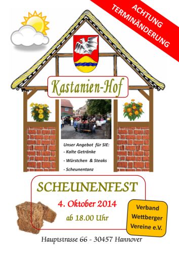 Also, Samstag, 4. Oktober 2014, ab 18 Uhr, Scheunenfest im Kastanienhof, Hauptstraße 66 in Wettbergen.